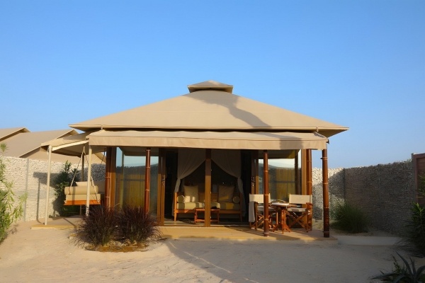 SZOBA: sátor: 2 fős, kb. 50 m2, légkondicionált, fürdőszoba (kád vagy zuhany, wc; kozmetikai készlet), vezeték nélküli internet, televízió, széf, kávéfőző, kávé/tea készlet; felár ellenében: minibár (fogyasztás szerint); terasz (asztal és székek); sátor saját medencével felár ellenében.