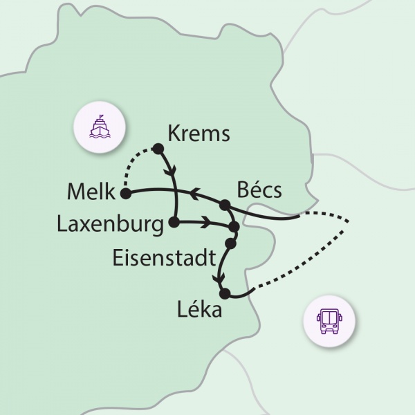 Reggeli után buszunkkal Mayerlingbe megyünk, melynek neve egy szomorú esemény miatt lett ismert. Rudolf trónörökös itt lett (a hivatalos verzió szerint) öngyilkos. Ennek helyszínére egy kápolnát és múzeumot emeltek, utalva a szomorú nap történéseire. Ezután a Habsburg család talán legszebb vadászkastélyához megyünk, ez a Laxenburgi kastély. Mária Terézia korában kezdték a park látványos kialakítását. Sissi és Ferenc József itt töltötte mézesheteit. A szépen gondozott parkon keresztül megyünk a várkastélyhoz. A Franzensburg vár belső kialakítása nagyon elegáns. A 24 teremben impozáns bútorok, stukkódíszítések sorát csodálhatjuk meg. Van olyan terem, melynek magyar vonatkozásáról is tájékoztatnak bennünket. A szobák megtekintése után bizton állíthatjuk, hogy nem véletlenül tartják ezt az egyik legszebb Habsburg kastélynak. Ezt követően Melkbe megyünk. Megtekintjük a mesés melki Benedek-rendi apátság belső udvarát, múzeumszobáit, templomát. Ezen a helyen több mint 900 éve élnek szerzetesek. Az apátság templomát néhány éve szépen felújították. A barokk stílusú apátsági templom homlokzatán Szent Péter és Szent Pál szobra látható. A templombelső legfőbb látványosságai a freskók, a szószék és a főoltár. Ezt követően - még Melkben - hajóra szállunk. Hajóutunk kastélyok, várak, kisvárosok mentén halad. Ausztriában ez a Duna leghangulatosabb szakasza. Méltán került fel ez a Wachaui-vidék az UNESCO Világörökségei közé. Két órás hajóutunk Kremsig tart, ahol autó?buszunk vár bennünket. Programunk befejezése után visszamegyünk a szállásunkra.