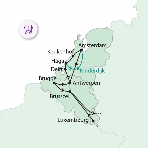 A nyári időszakban (amikor már nem nyílnak a tulipánok) Delft és Hága után nem Keukenhof tulipánparkját nézzük meg, hanem egy másik különleges helyet, Kinderdijk-et keressük fel. A területet az 1700-as évek közepén alakították ki és a szélmalmok gazdasági felhasználását mutatja be. Egymáshoz közel 19 szélmalom található itt. Fakultatív hajózási lehetőség a malmok közötti csatornákon. Ezt a különlegességet az UNESCO beválasztotta a Világörökségek közé. Az érdekes látványosság után elfoglaljuk hollandiai szállásunkat.
