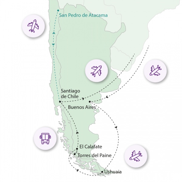 A mai napon, akik úgy döntöttek, hogy hazautaznak, nekik a reptérre indulásig szabadprogram, majd transzfer a repülőtérre és csoportosan, de idegenvezető nélkül Budapestre utazás. Érkezés Budapestre 15. nap délutánján. A hosszabbítást választók Santiago de Chiléből Calamába repülnek, majd transzfer a szállodába San Pedro de Atacamába. Az Atacama-sivatag szívében található San Pedro de Atacama egy oázis, az élet létfontosságú forrása a világ legszárazabb sivatagában. A nap második felében a Laguna Piedrához látogatunk, melynek felszínén lebegni lehet a magas sótartalma miatt. A Tebinquiche lagúnában az Andok vulkánjainak visszatükröződését fogjuk látni. Végül a két kisebb lagúnát magába foglaló Ojos del Salar-nál állunk meg, amelyet lélegzetelállító táj ölel körül.