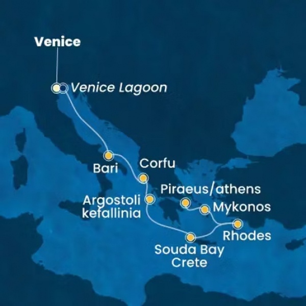 A VELENCÉTŐL ATHÉNIG - Görög szigetek nyomában a Costa Deliziosán | HJTD - HAJÓUTAD csoportos hajóút magyar idegenvezetővel ideális választás mindazok számára, akik szervezett formában, kényelmesen, magyar nyelvű kísérettel szeretnék felfedezni a Földközi-tenger keleti medencéjének legszebb és legizgalmasabb kikötőit. Ez az útvonal harmonikusan ötvözi Velence történelmi hangulatát, a görög szigetek változatos tájait és az Égei-tenger különleges világát. A hajóút során olyan ikonikus állomásokat érintünk, mint Korfu zöldellő szigete, Kefalónia festői fővárosa, Argostoli, valamint Kréta északi partján fekvő Souda-öböl, amely kiváló kiindulópont a sziget történelmi és természeti látnivalóinak felfedezéséhez. Rodosz középkori városfalaival és mediterrán hangulatával az út egyik legkülönlegesebb állomása, míg Mikonosz fehér házai, szélmalmai és pezsgő élete igazi görög szigeti hangulatot kínálnak. A hajóút végállomása Pireusz, Athén kikötője, ahonnan a klasszikus görög civilizáció emlékei és a modern görög főváros nyüzsgése is könnyen elérhető. A Costa Deliziosa elegáns és kényelmes óceánjáró, amely tökéletes hátteret biztosít egy valódi mediterrán hajózáshoz. A fedélzeten medencék, napozóteraszok, wellness és spa részleg, sportolási lehetőségek, látványos esti előadások, bárok és hangulatos közösségi terek várják az utasokat. A gasztronómiai kínálat változatos - az olasz konyha klasszikusaitól a nemzetközi specialitásokig mindenki megtalálja a kedvére valót. Csoportos hajóútként, magyar idegenvezető végigkísérésével az utazás biztonságos és kényelmes - segítséget kap a beszállásnál, a fakultatív kirándulások szervezésénél és a mindennapi ügyintézés során is. Így Önnek nem kell mással foglalkoznia, csak az élményekkel, a görög szigetek felfedezésével és a mediterrán hajózás különleges pillanatainak megélésével.