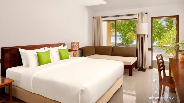 A Sunset tengerparti villa kb. 41 m? alapterületű, két fő számára ideális, és egy pótágyat biztosít. A villa egyénileg szabályozható légkondicionálással rendelkezik. A fürdőszobában kád, WC és hajszárító található, valamint külső zuhany is rendelkezésre áll. A vendégek számára műholdas televízió, telefon, minibár (naponta vízzel feltöltve), széf, kávé- és teafőző készlet, valamint ingyenes kiságy áll rendelkezésre 2 év alatti gyermekek számára, amelyet előzetesen kell igényelni. A terasz asztallal és székekkel van felszerelve, és közvetlen kijáratot biztosít a strandra.