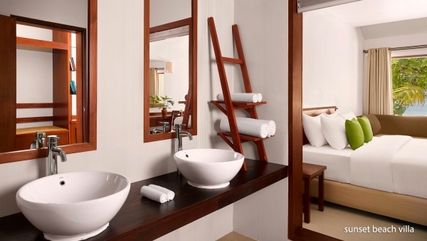 A Sunset tengerparti villa kb. 41 m? alapterületű, két fő számára ideális, és egy pótágyat biztosít. A villa egyénileg szabályozható légkondicionálással rendelkezik. A fürdőszobában kád, WC és hajszárító található, valamint külső zuhany is rendelkezésre áll. A vendégek számára műholdas televízió, telefon, minibár (naponta vízzel feltöltve), széf, kávé- és teafőző készlet, valamint ingyenes kiságy áll rendelkezésre 2 év alatti gyermekek számára, amelyet előzetesen kell igényelni. A terasz asztallal és székekkel van felszerelve, és közvetlen kijáratot biztosít a strandra.
