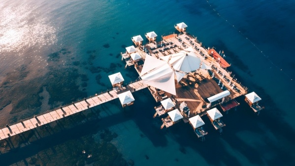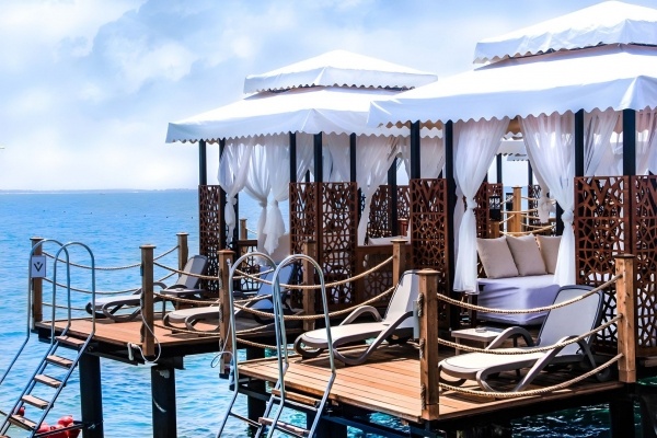 nyilvános strand, különálló szállodai rész, homokos-kavicsos, enyhe lejtés a tengerhez, móló, Kék Zászlóval kitüntetett, hozzáférés a szálloda területén keresztül, ingyenes napernyők és napozóágyak