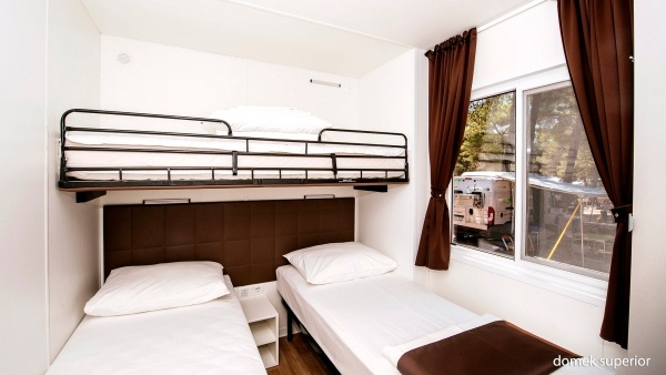 Deluxe ház - 3 hálószobával (4 fő, 1 pótágy lehetőséggel) Méret: kb. 35 m?, légkondicionált Helyiségek: 3 hálószoba, nappali, 2 fürdőszoba (zuhanyzó, WC) Felszereltség: Vezeték nélküli internet Műholdas televízió Felszerelt konyhasarok (gázfőző, mikrohullámú sütő, vízforraló, kávéfőző, hűtőszekrény, edények, evőeszközök) Terasz: Fedett, kb. 25 m? (asztal, székek, ruhaszárító) Felár ellenében: Kiságy 2 év alatti gyermek számára (előzetes rendelés szükséges, kb. 8 EUR/nap) Superior ház - 2 hálószobával (5 fő, 1 pótágy lehetőséggel) Méret: kb. 35 m? Helyiségek: 2 hálószoba, nappali, 2 fürdőszoba (zuhanyzó, WC) Felszereltség: Vezeték nélküli internet Műholdas televízió Felszerelt konyhasarok (gázfőző, mikrohullámú sütő, vízforraló, kávéfőző, hűtőszekrény, edények, evőeszközök) Terasz: Részben fedett (asztal, székek, ruhaszárító) Felár ellenében: Kiságy 2 év alatti gyermek számára (előzetes rendelés szükséges, kb. 8 EUR/nap)