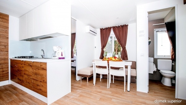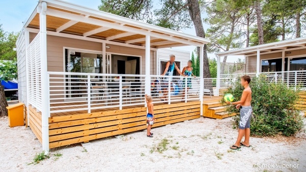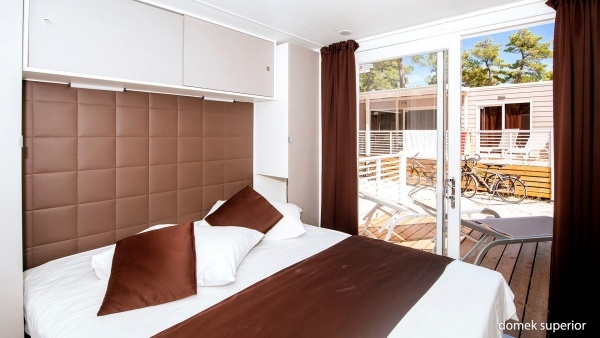 Deluxe ház - 3 hálószobával (4 fő, 1 pótágy lehetőséggel) Méret: kb. 35 m?, légkondicionált Helyiségek: 3 hálószoba, nappali, 2 fürdőszoba (zuhanyzó, WC) Felszereltség: Vezeték nélküli internet Műholdas televízió Felszerelt konyhasarok (gázfőző, mikrohullámú sütő, vízforraló, kávéfőző, hűtőszekrény, edények, evőeszközök) Terasz: Fedett, kb. 25 m? (asztal, székek, ruhaszárító) Felár ellenében: Kiságy 2 év alatti gyermek számára (előzetes rendelés szükséges, kb. 8 EUR/nap) Superior ház - 2 hálószobával (5 fő, 1 pótágy lehetőséggel) Méret: kb. 35 m? Helyiségek: 2 hálószoba, nappali, 2 fürdőszoba (zuhanyzó, WC) Felszereltség: Vezeték nélküli internet Műholdas televízió Felszerelt konyhasarok (gázfőző, mikrohullámú sütő, vízforraló, kávéfőző, hűtőszekrény, edények, evőeszközök) Terasz: Részben fedett (asztal, székek, ruhaszárító) Felár ellenében: Kiságy 2 év alatti gyermek számára (előzetes rendelés szükséges, kb. 8 EUR/nap)
